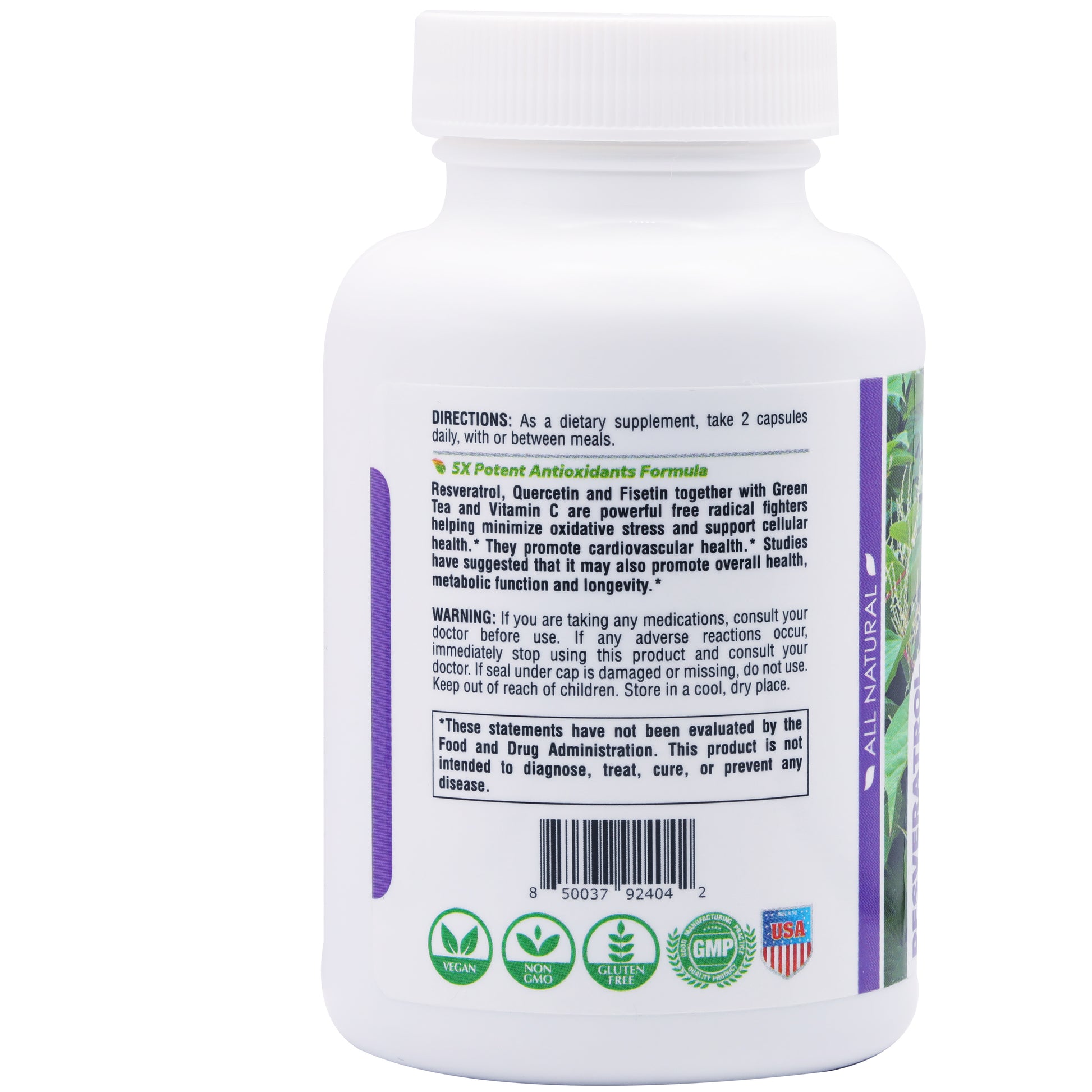 - 100% MONEY BACK SATISFACTIOIN; Non-GMO, Gluten-free, Vegan; Made in USA cGMP facilities; 100% natural and plant based, ideal vegetarian resveratrol supplements